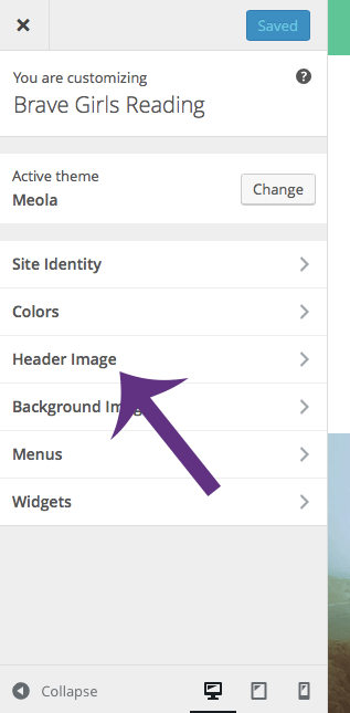 (click to enlarge) - Select the menu option for “Header” or “Logo” settings. The options available in the customizer are not standard throughout WordPress and are determined by the theme developer. You might have to search a bit to find section in your theme that allows for customizations. Here are a couple examples of what you’re looking for: