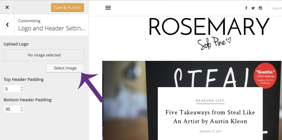 (click to enlarge) - Once you’ve found the area that controls your header, click “Select Image”.
