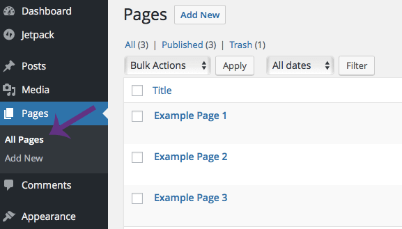 (click to enlarge) - Select “All Pages” from the drop-down menu under “Pages” in the left side bar, and familiarize yourself with the titles of the pages you previously created.