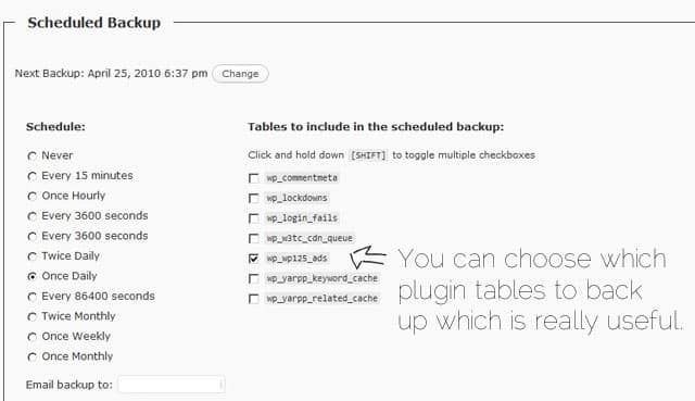 Obviously it does other things too, but strictly from a backup point of view it’s good. It does the database plus your theme, plugins and even widgets too which is handy. You can set backups to email or upload to an FTP although the email option makes more sense as chances are you’ll need the backup because you can’t get onto your host or something like that.
