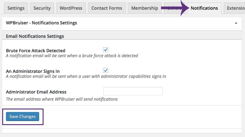 (click to enlarge) - Notifications Tab: This tab allows you to determine under what circumstances WPBruiser will send you an email. You can choose to be notified every time an administrator logs into your site, or just when the plugin detects a “Brute Force Attack”. You can also edit where these emails are sent if the site owner and developer are different people.