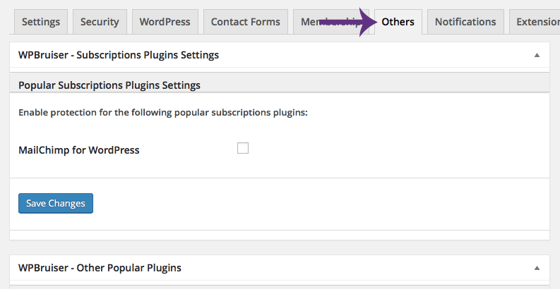 (click to enlarge) - Others Tab: The others tab allows you to choose if you want other plugins already installed on your site to be protected as well. In this case, it gives me the option to extend coverage to my MailChimp plugin.