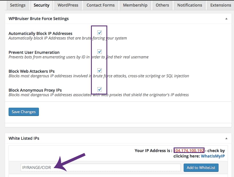 (click to enlarge) - Security Tab: The security tab allows you to determine which IP address you’d like to block. An IP address is a specific number that’s issued to you by your internet service provider. Think of it like your WiFi’s phone number. We’d recommend clicking all the boxes on this page. Automatically blocking an IP address that’s executing a brute force attacks on your site is always a good idea. It’s good to know, however, that this step won’t protect you entirely. Hackers have ways to disguise and hide their IP addresses, and would still be able to access your site from a public library or coffeeshop. We’d also recommend copy-and-pasting your own IP Address into the “Add to WhiteList” field. This will make sure that WPBruiser doesn’t think you’re ever trying to hack into your own site, and never sees a network you know is safe as a threat.