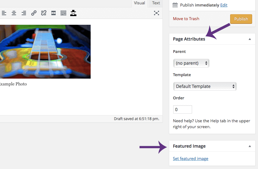 - Edit your settings under “Page Attributes”. The content of this section is determined by your theme’s developer, so it make look different than mine. In this case, I have the option to select a “Parent” page which will pull the formatting for any pages I’ve already created. Under “Template” I have the option to select page settings that have been pre-specified by the developer. For example, this is where I’d choose if I want the page to be full-width or to include a sidebar.