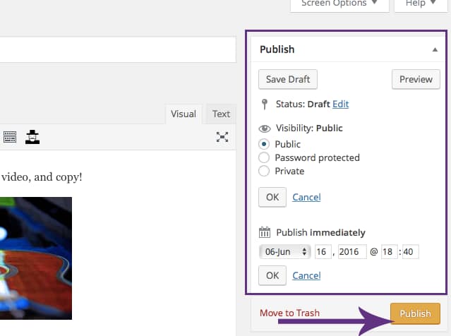 (click to enlarge) - If necessary, edit the visibility and publishing date settings for your page, then click “Publish”.