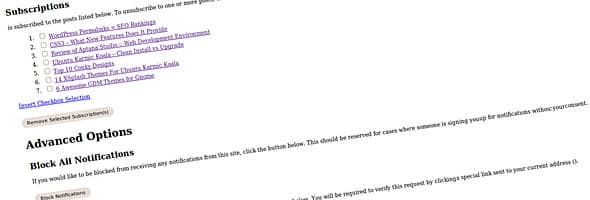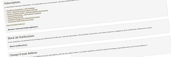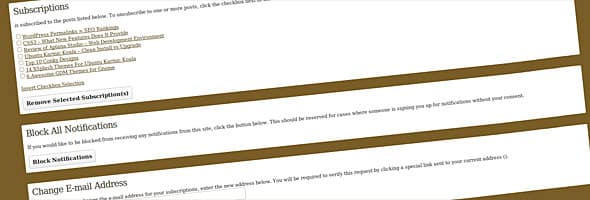 Subscribe to Comments is a robust plugin that enables commenters to sign up for e-mail notification of subsequent entries. The plugin includes a full-featured subscription manager that your commenters can use to unsubscribe from certain posts, block all notifications, or even change their notification e-mail address! It’s an excellent plugin used by so many people, but it was last updated in Dec 2007 with no easy option for changing its layout. That’s the reason for this simple tutorial.