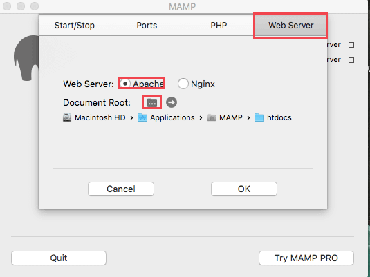 which will make your life easier later. You will be prompted for your computers admin password every time you start your server, so make sure you remember it!(click to enlarge) - Next, click to the tab within preferences that says ‘Web Server’. Make sure ‘Apache’ is selected and click the folder icon option under ‘Document Root.’