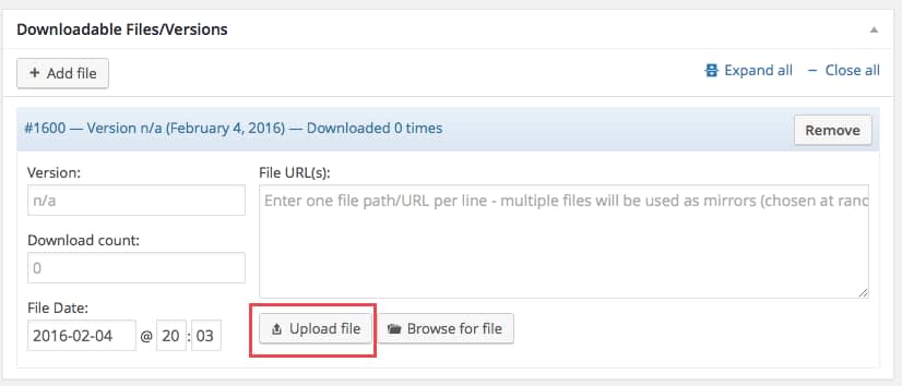 (click to enlarge) - Below the text editor, find the section titled “Downloadable File/Versions” and select “Add File”.