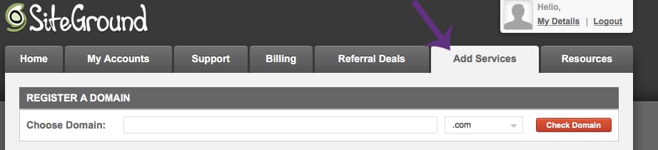 - If you don’t already have a new domain, head over to your “Add Services” tab and register a new one. Skip this step if you’re setting up the domain you registered when you signed up for your new hosting account.