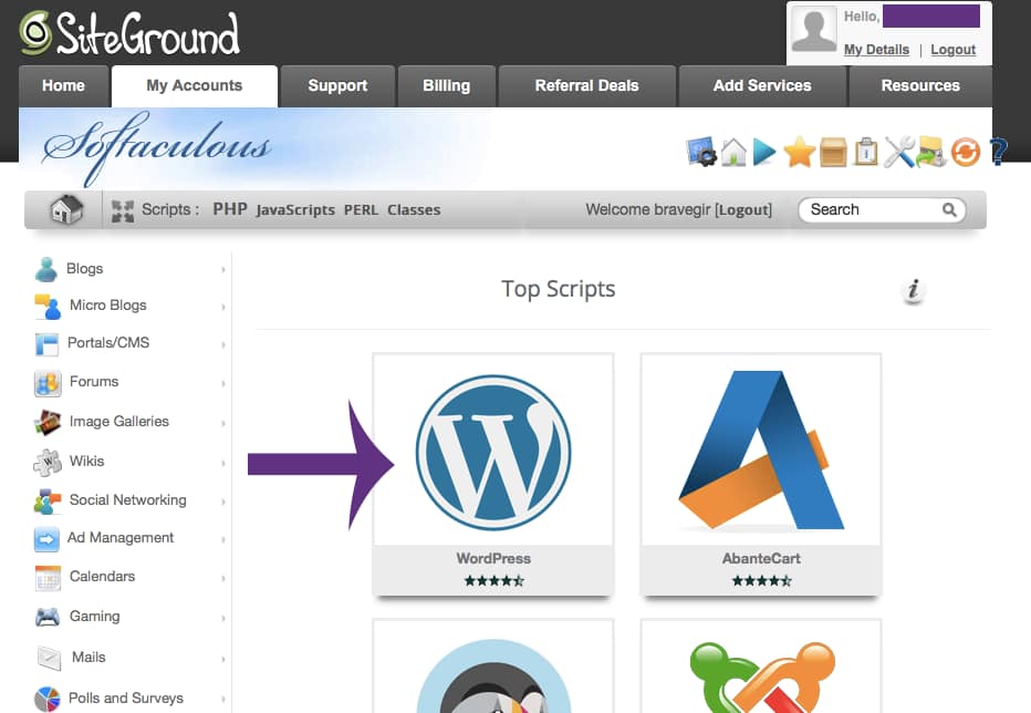 (click to enlarge) - Hover over the icon for “WordPress” then click the “Install” button that appears.