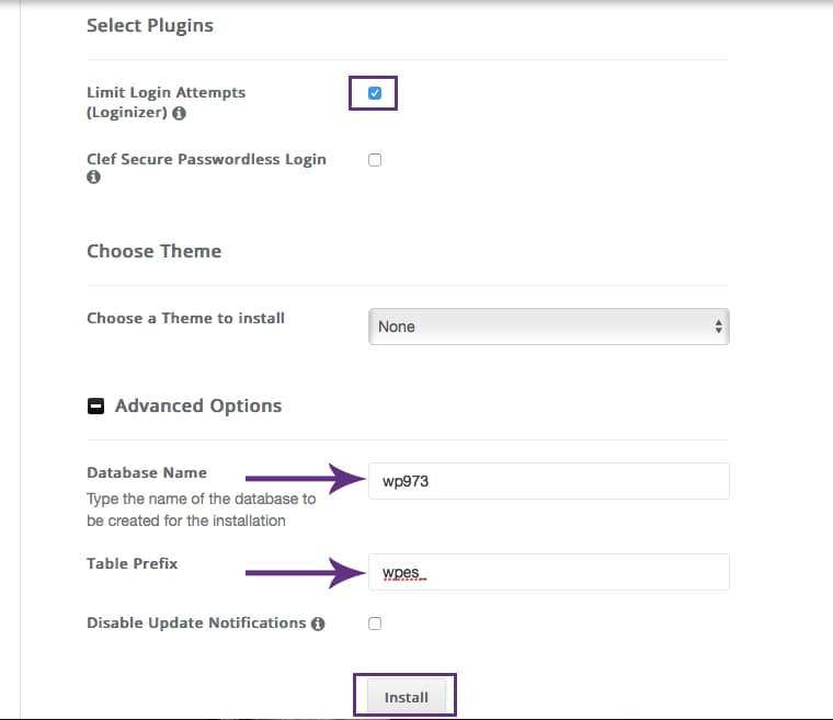 - You can also customize the settings for your “Database Name” and “Database and Table Prefix” (optional).