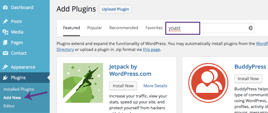 - Type “Yoast” in the search box under “Add Plugins”, then click enter.