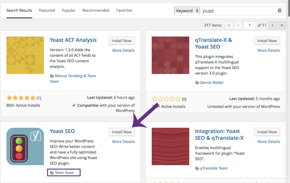 (click to enlarge) - In the search results, find the “Yoast SEO” plugin by “Team Yoast”, then click “Install Now”.
