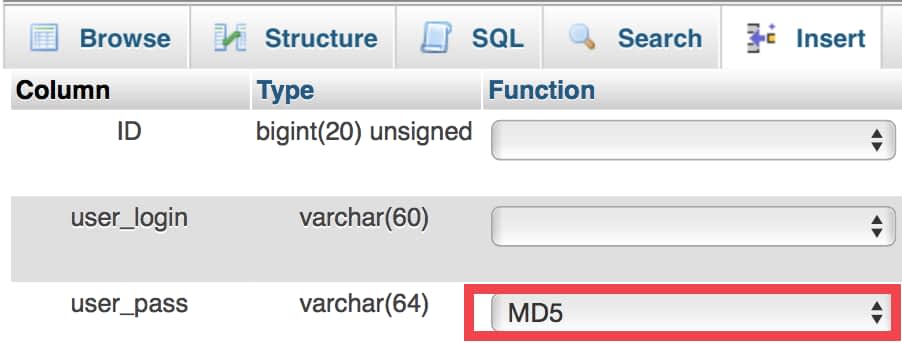 - Click on the dropdown menu on the same line and select MD5. This’ll run the MD5 hashing algorithm on the value we just typed, making it into one that WordPress can work with. Hashing functions are a core part of how passwords are stored securely. David wrote a longer post about that, if you’re interested.