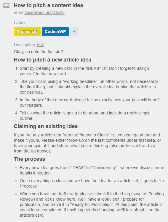 We use Trello for managing the whole process. Every content idea goes through different Trello lists, and gets various labels/statuses assigned to it. The cool thing about the Trello setup is that everything is really easy to grasp, works with drag-and-drop, and is public across the whole board – so any writer can see the discussions under any other writer’s cards. We use 8 Trello lists to handle everything. They are: