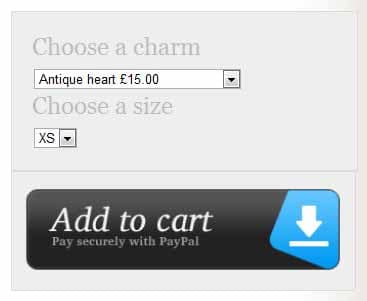I needed to be able to select different types of bracelet (which cost different amounts), so the first customisation was adding drop down menus with a price option. I then needed sizes, so a drop down menu with the different sizes was the next customisation. If you need text, add a text field.