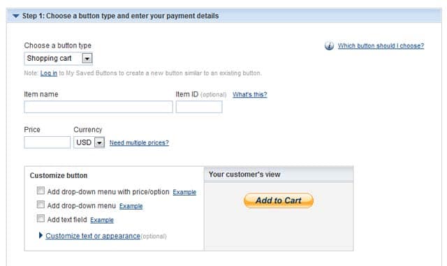 The button creator tool is surprisingly easy and versatile. You can choose from a couple of different button types — shopping cart, recurring payment or just buy it now are the ones you’re likely to use — depending on what you want to sell. I used the shopping cart button.