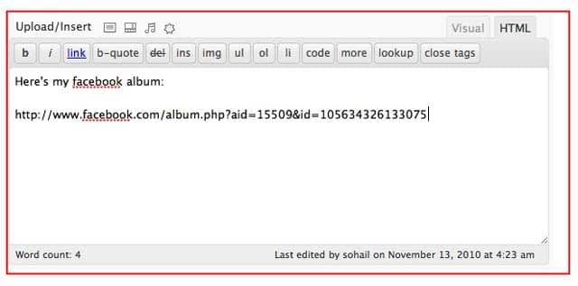 The plugin literally takes any link to a public page, album or whatever and embeds the content into your post — the plugin’s site has the picture below showing you how to use it: